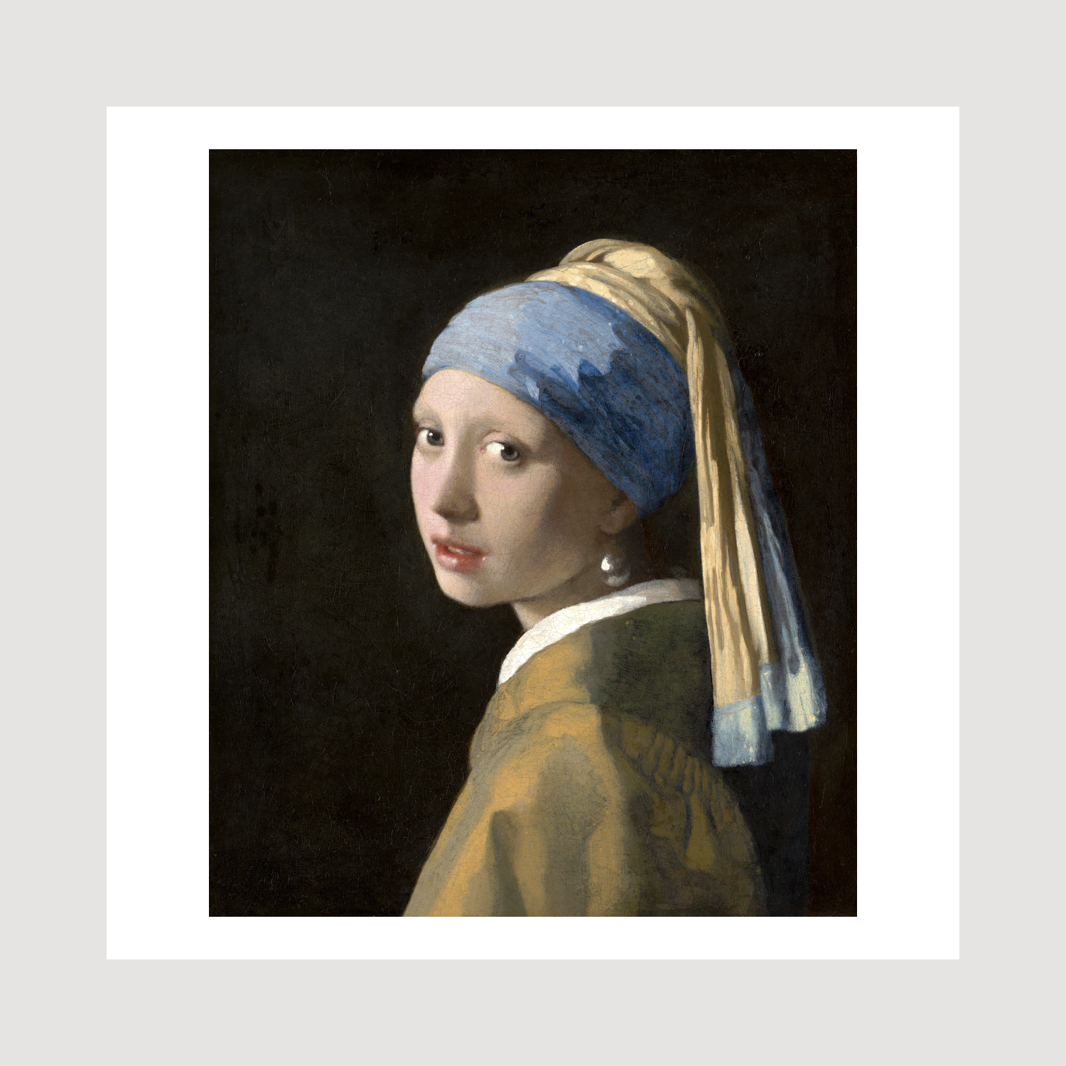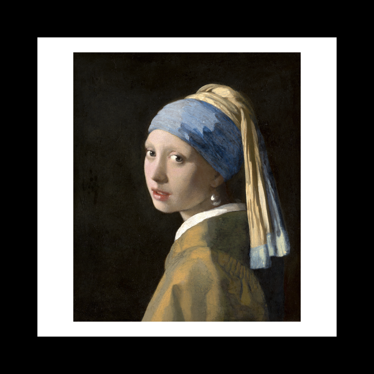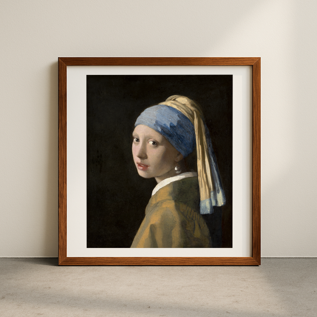 "Girl with a Pearl Earring" stands as one of Johannes Vermeer's most captivating works, showcasing his mastery of light and intimate portraiture. The painting depicts a young woman glancing over her shoulder, her face emerging from a dark background in Vermeer's characteristic chiaroscuro style. The subject's exotic dress - a blue and yellow turban and a lustrous pearl earring - creates an air of mystery and allure, while her penetrating gaze draws viewers into an eternal moment of connection.
