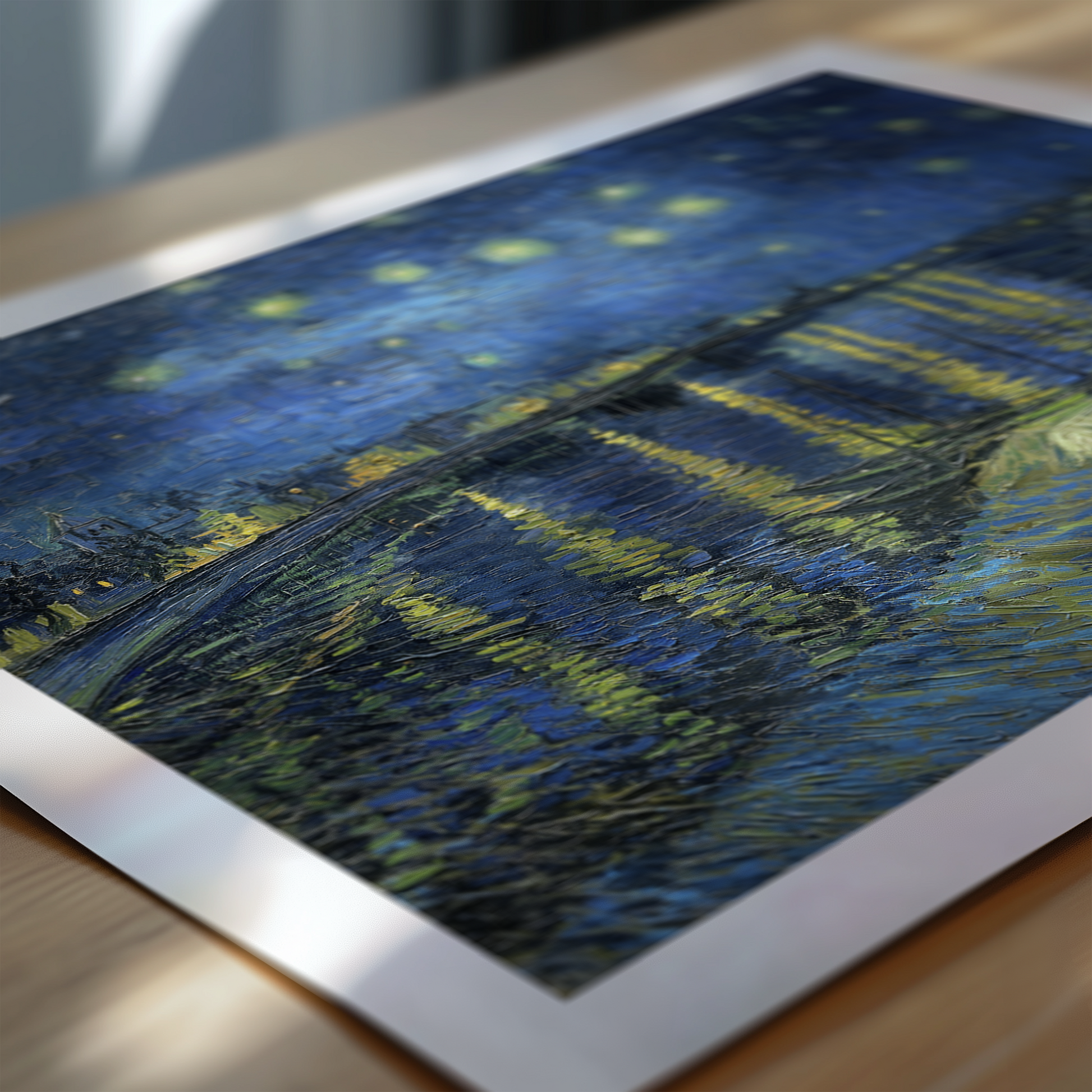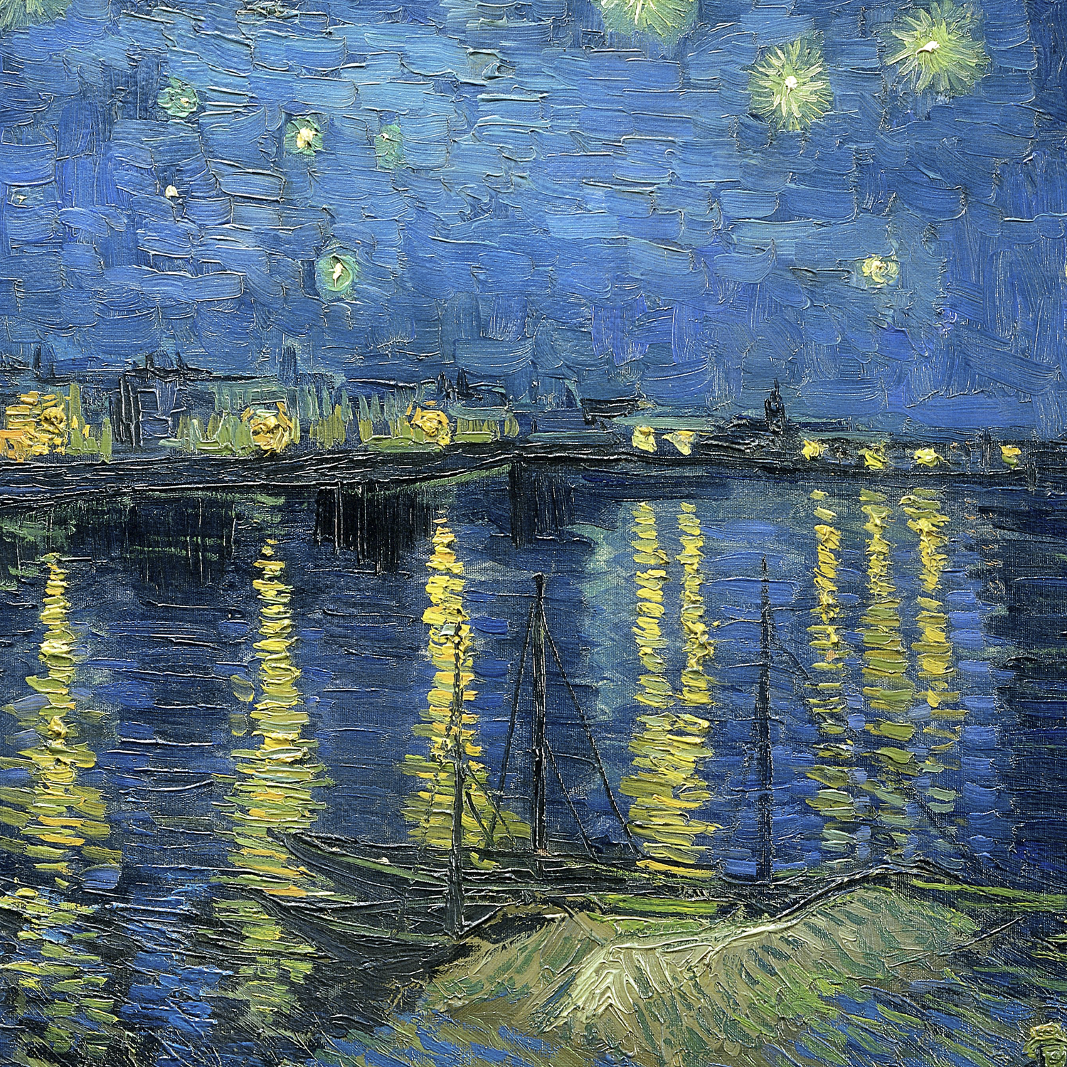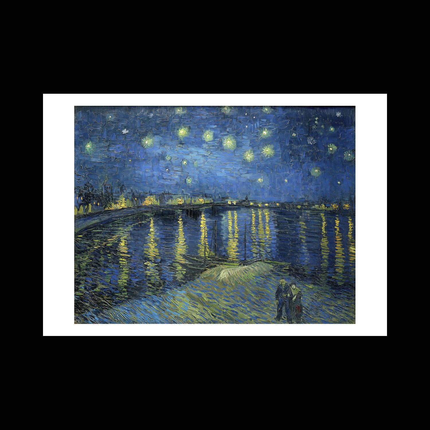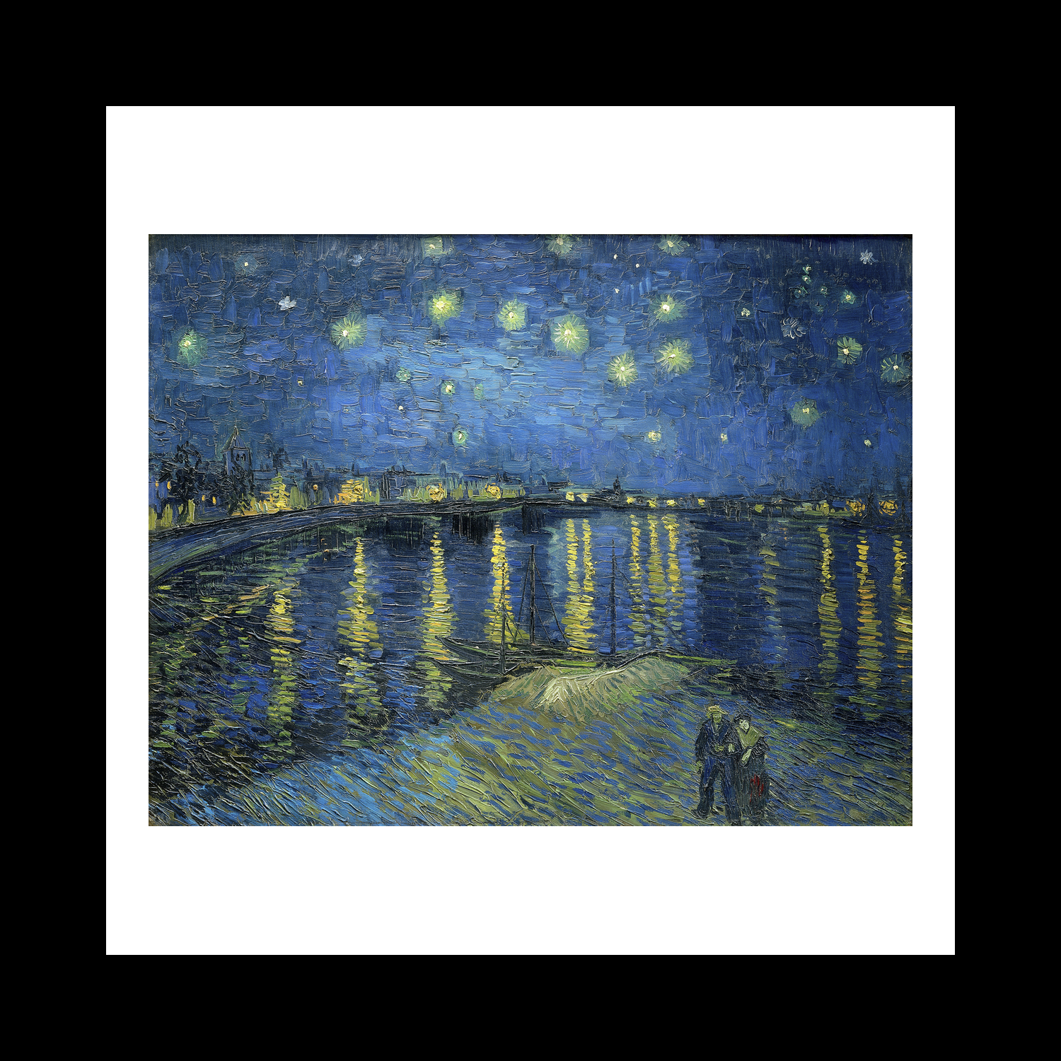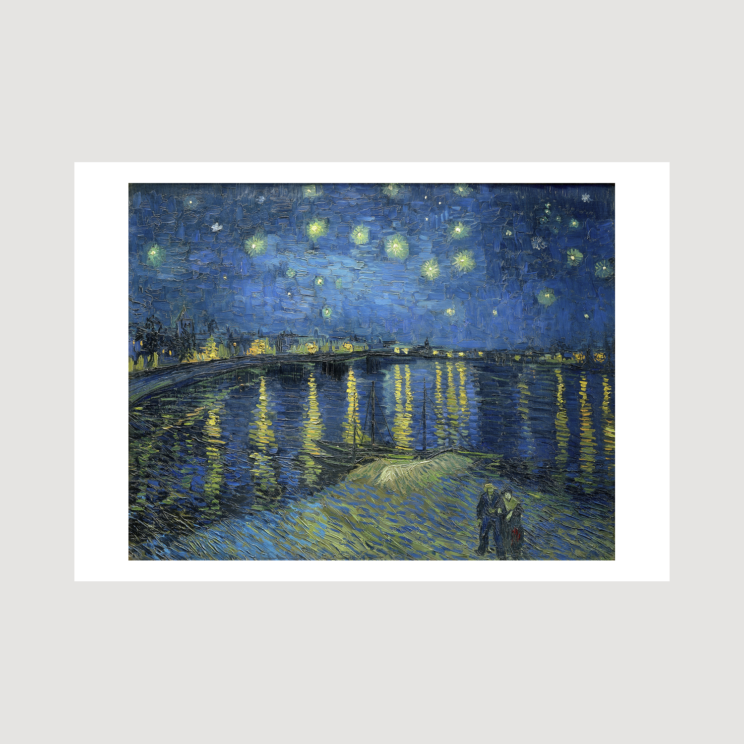 Starry Night Over the Rhône (1888) captures van Gogh's distinctive vision of Arles, France, where he painted this mesmerising nocturnal scene. The artwork showcases his characteristic impasto technique, with thick, expressive brushstrokes creating a vibrant dance of light across the water. The gas lighting from the town reflects in the river, creating golden spears that pierce the deep blues of the night, while two lovers stroll along the foreground, dwarfed by the vast celestial display above.