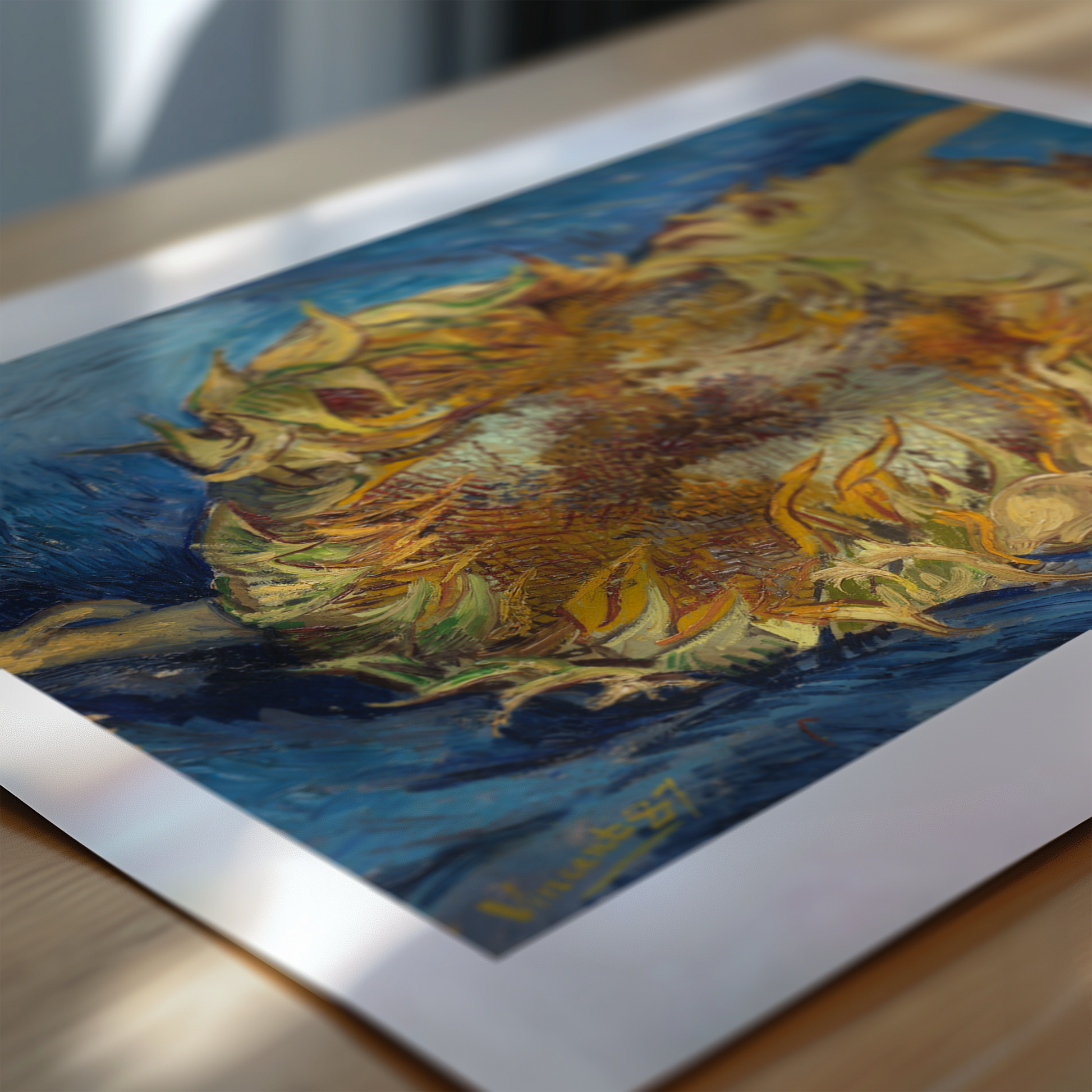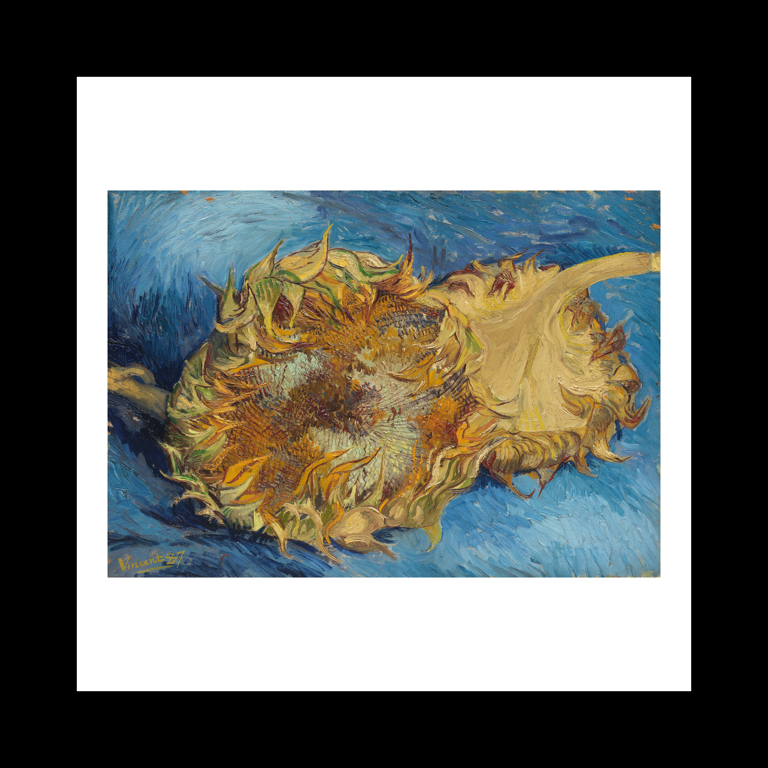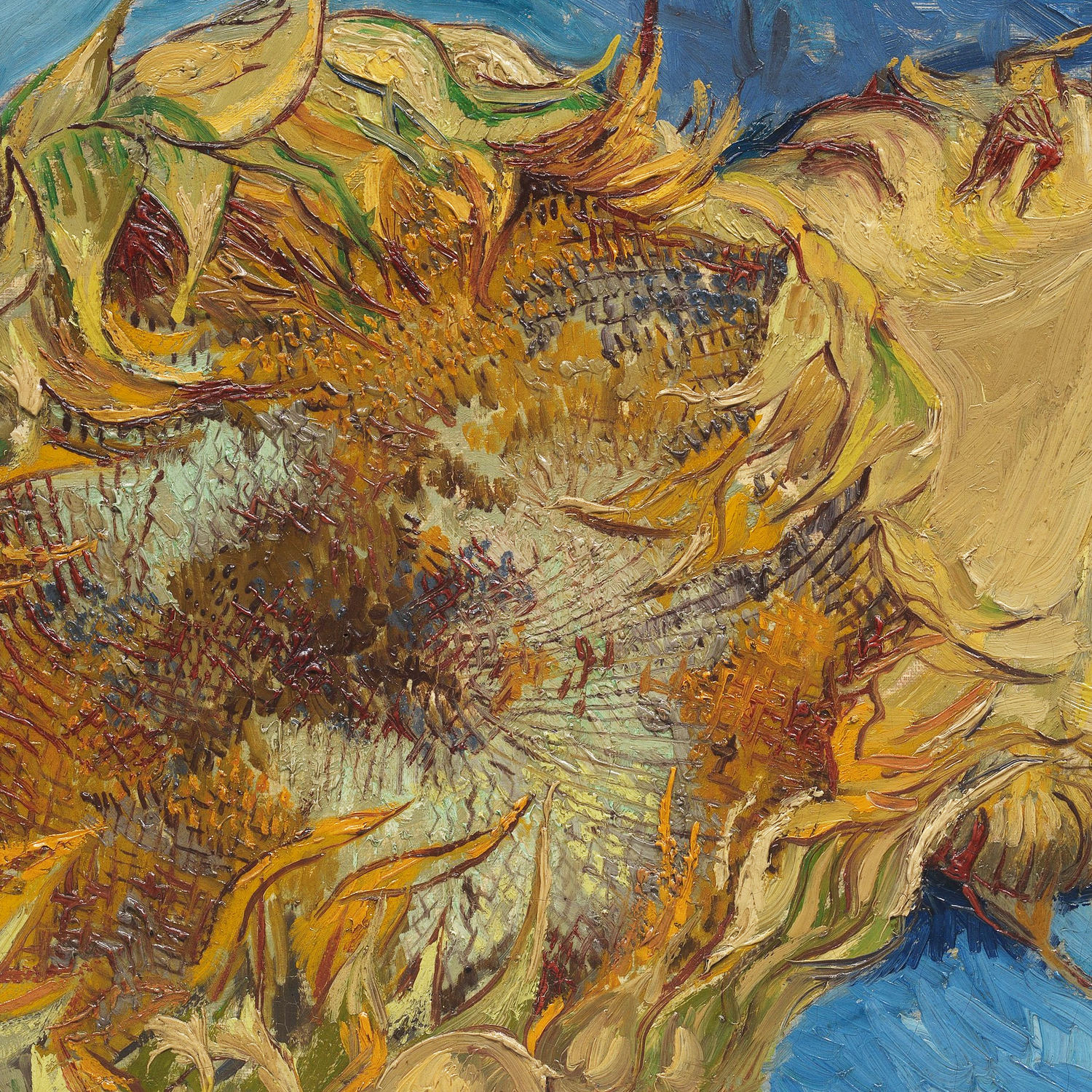 Van Gogh's 'Sunflowers' (1887) stands as one of several variations in his celebrated sunflower series, painted during his time in Arles, France. The vibrant yellow blooms, set against a yellow background, create an intense monochromatic study that showcases Van Gogh's mastery of colour and emotional expression. The thick, impasto brushstrokes and bold outlines characteristic of his post-impressionist style bring the flowers to life, with each petal and seed head rendered in meticulous detail.