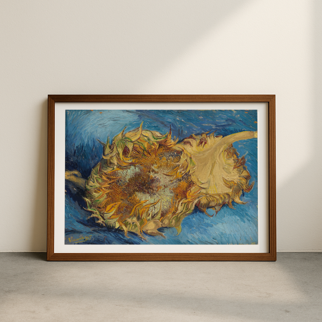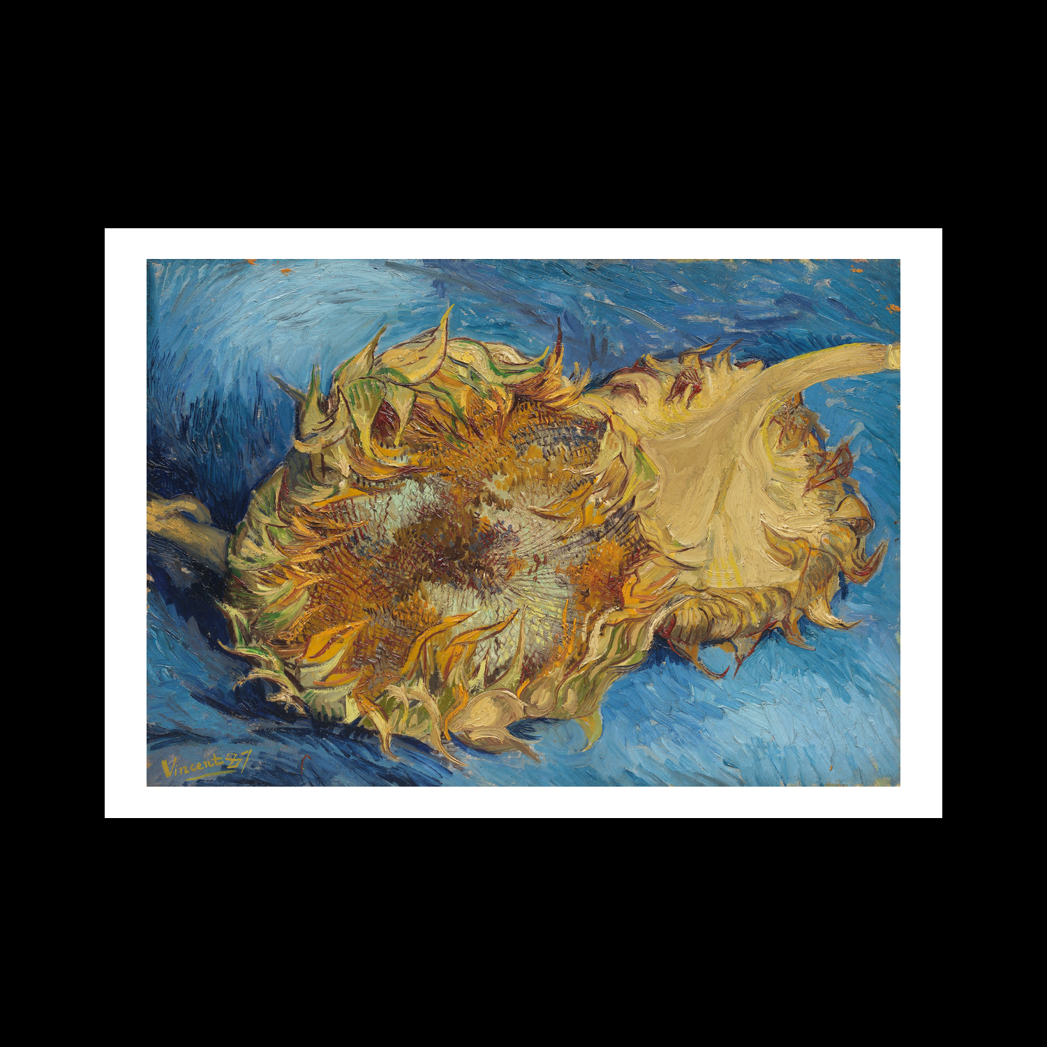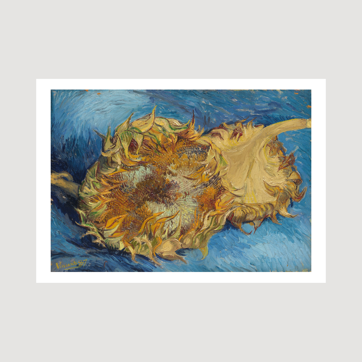 Van Gogh's 'Sunflowers' (1887) stands as one of several variations in his celebrated sunflower series, painted during his time in Arles, France. The vibrant yellow blooms, set against a yellow background, create an intense monochromatic study that showcases Van Gogh's mastery of colour and emotional expression. The thick, impasto brushstrokes and bold outlines characteristic of his post-impressionist style bring the flowers to life, with each petal and seed head rendered in meticulous detail.