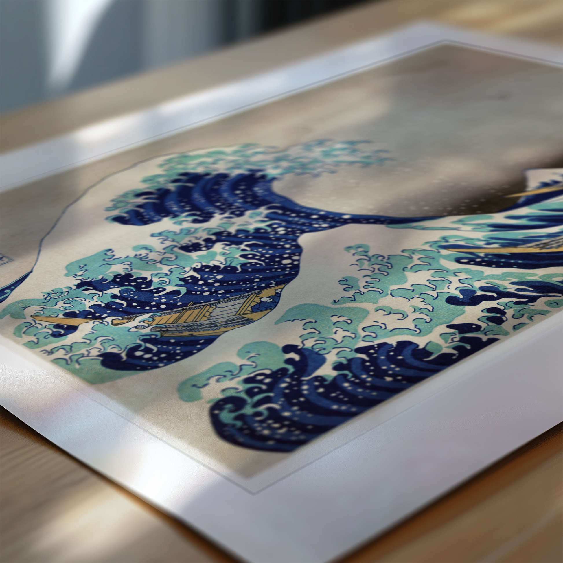 The composition brilliantly demonstrates Hokusai's mastery of the ukiyo-e technique. The wave's distinctive claw-like foam tendrils show strong influences from both Japanese art and European copper engravings, which were reaching Japan through Dutch traders. The use of Prussian blue pigment, a newly available material at the time, creates the print's striking colour palette and demonstrates Hokusai's eagerness to experiment with new artistic materials.