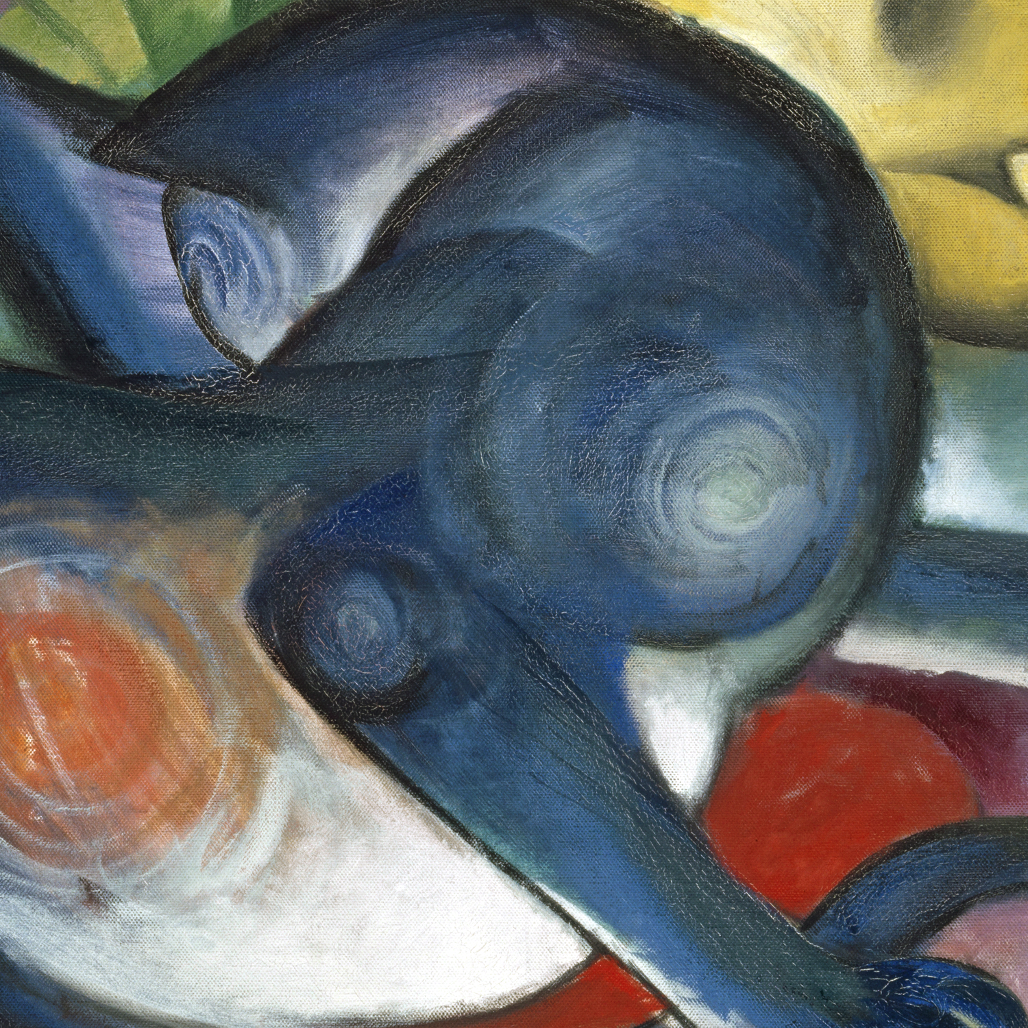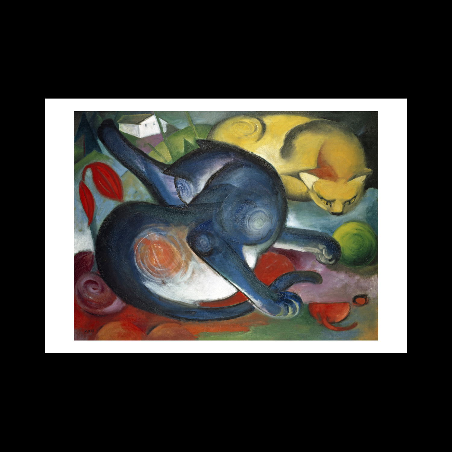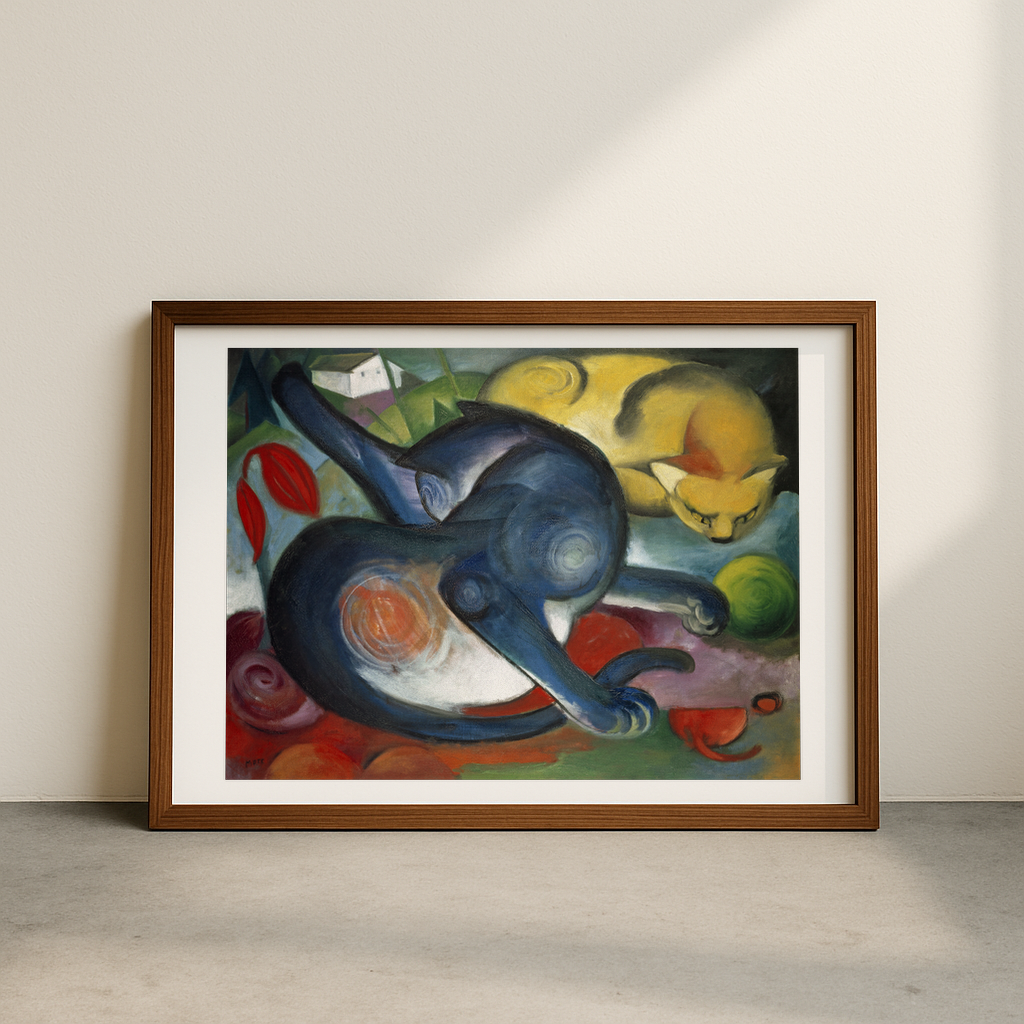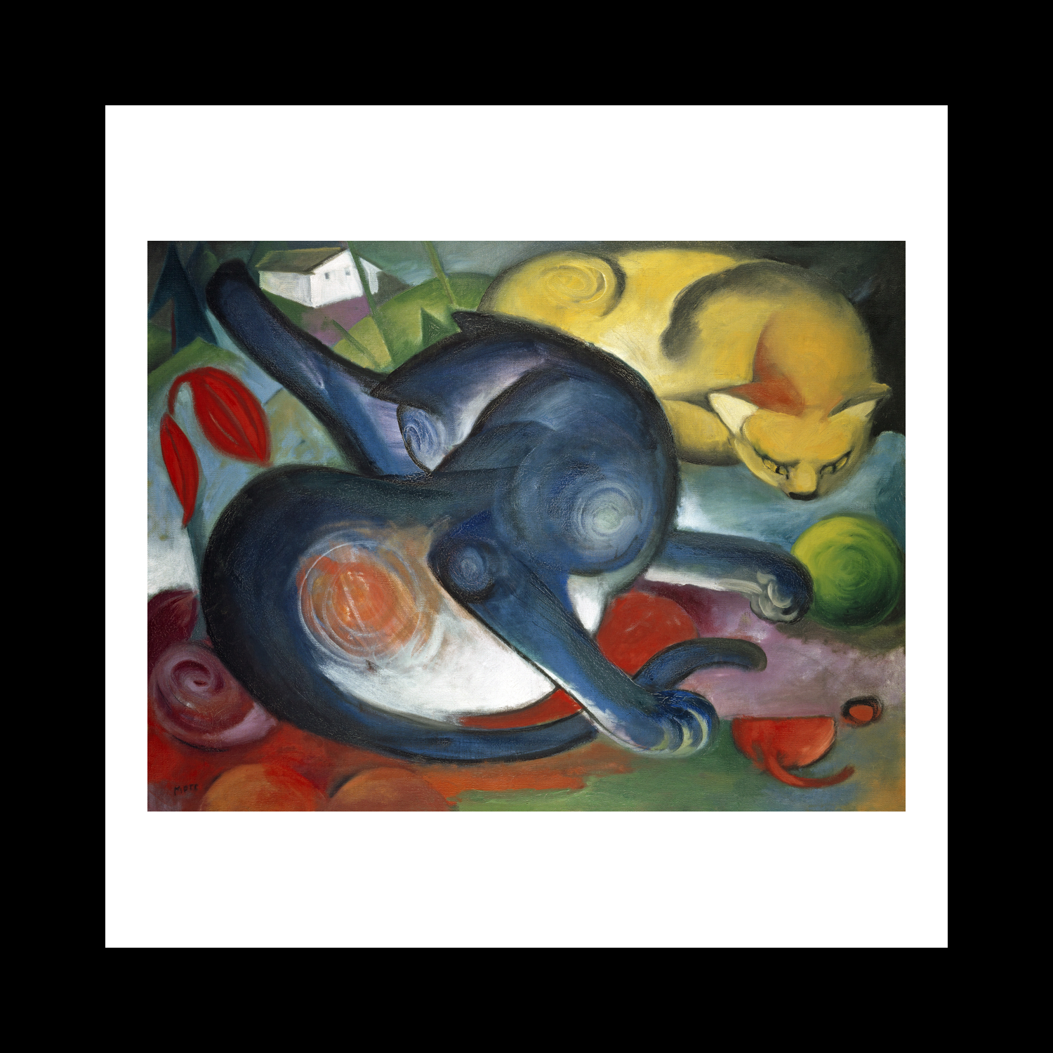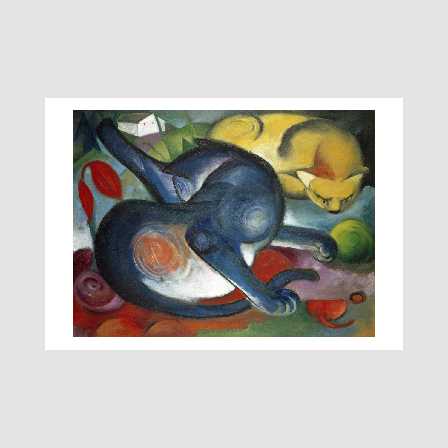 Marc's fascination with animals stemmed from his belief that they possessed a purer connection to nature than humans. As a founding member of Der Blaue Reiter (The Blue Rider) group, he sought to capture the spiritual essence of his subjects through colour symbolism. Blue represented masculinity and spirituality, while yellow symbolised femininity and joy – making these cats a study in duality and balance.