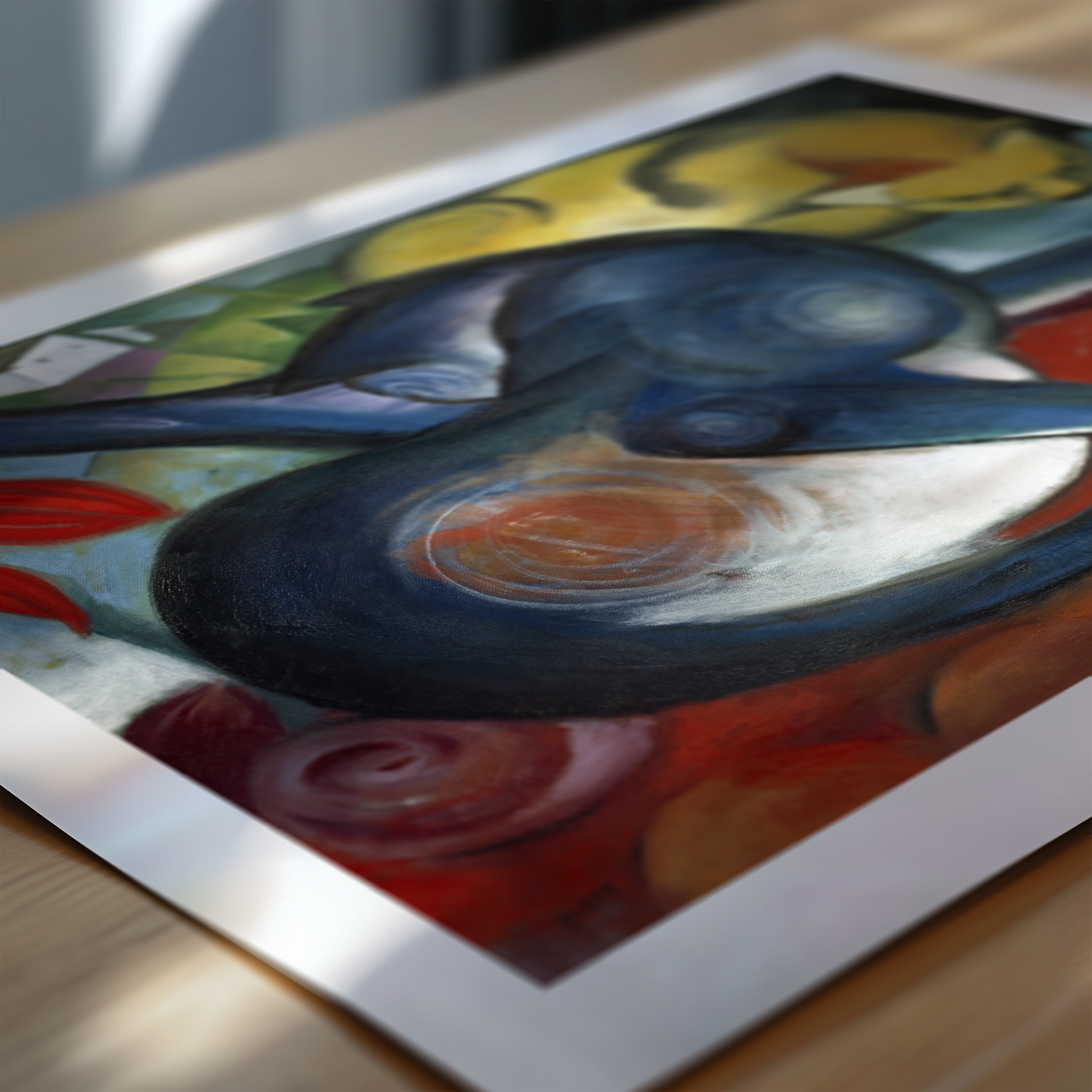 "Two Cats, Blue and Yellow" (1912) by Franz Marc exemplifies the German Expressionist movement's bold use of colour and emotional intensity. Marc's distinctive style transforms these felines into geometric forms, with their bodies composed of flowing, angular shapes in vibrant blue and yellow hues. The composition creates a harmonious interplay between the two cats, their bodies curved and intertwined in an almost abstract dance.