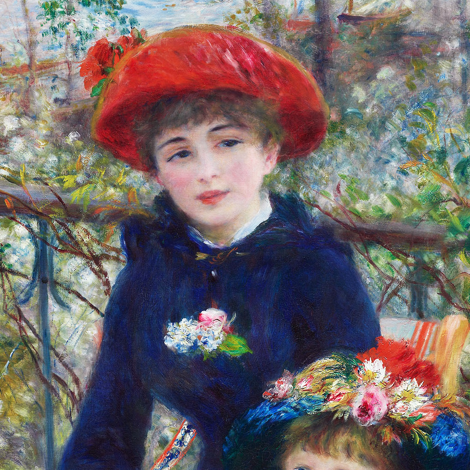 The composition showcases Renoir's exceptional ability to render fabric and light. The elder sister's flowered hat and striped bodice demonstrate his skill in depicting intricate patterns, while the younger girl's bright red bow adds a striking focal point. The background, though seemingly simple, reveals a complex layering of greens and blues, suggesting a lush garden terrace overlooking Paris, creating depth through subtle colour variations rather than rigid perspective.