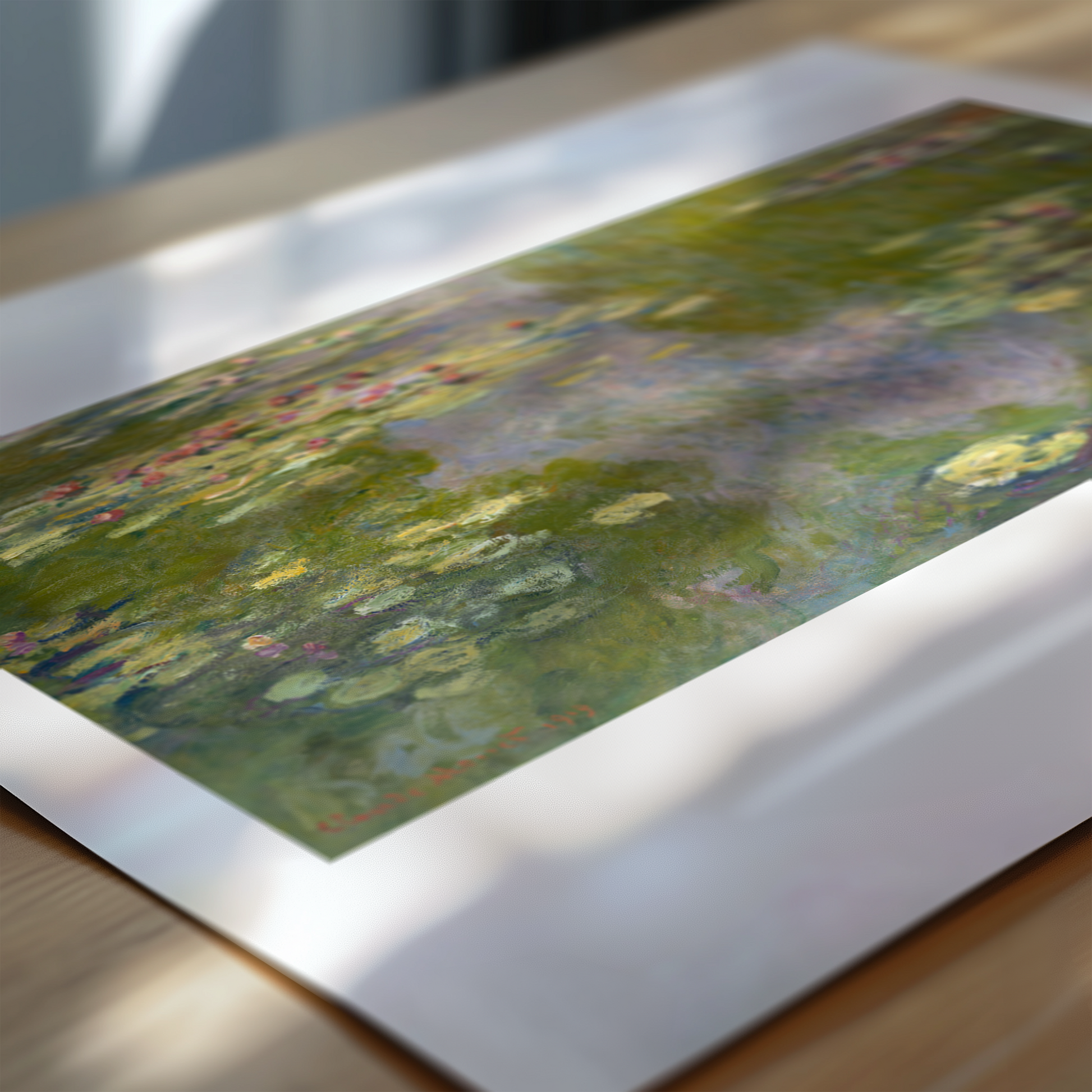 The piece exemplifies Monet's revolutionary approach to perspective, eliminating the horizon line to create an immersive, almost disorienting experience. This particular work showcases his technique of applying multiple layers of paint to achieve a luminous effect, with each brushstroke contributing to the overall impression of movement and depth. Created during the aftermath of World War I, this peaceful scene reflects Monet's desire to create art that offered solace and contemplation during troubled times, making it particularly resonant with viewers both then and now.